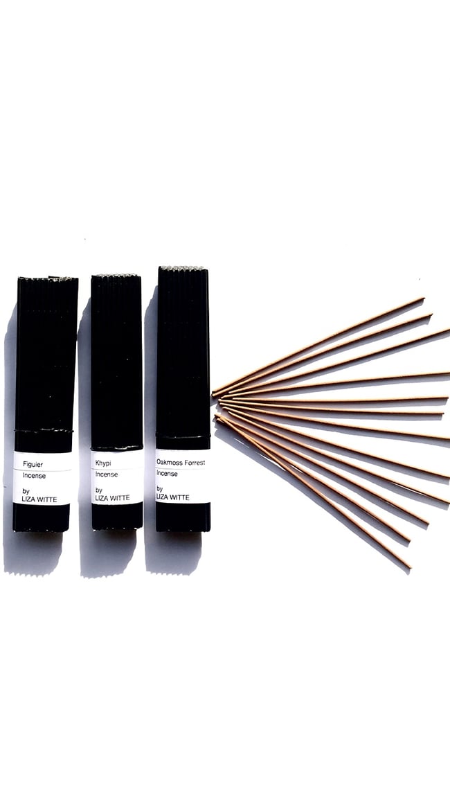 a very fine aromatic blend with fig leaves we picked in greece, herbs, cedar wood and frankincense carterii. Like sitting under a fig tree on a summer evening